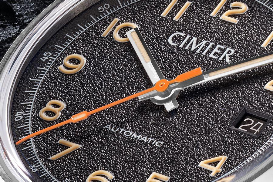 - Brushed baton hour and minute hands with polished chamfers. Orange-painted seconds hand. All hands filled with Swiss Super-Luminova GL old radium (LE) lume.