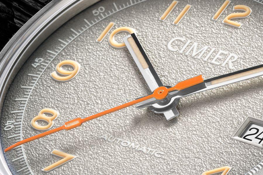 - Brushed baton hour and minute hands with polished chamfers. Orange-painted seconds hand. All hands filled with Swiss Super-Luminova GL old radium (LE) lume.